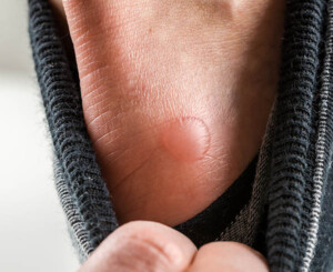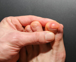 Corn is a common foot ailment characterised by a rough patch of skin in areas subjected to friction and/or pressure (top of the toes, heel, between the toes, etc). Corns can be of two kinds: soft corns and hard corns. Hard corns usually appear on hard dry, flat areas of skin, while soft corns are often found between the toes. Corns are characterised by a conical shape with a broad top and a pointy bottom. Corns are not serious, but can cause discomfort or pain, due to the irritation or inflammation caused by the pressure on the underlying skin.